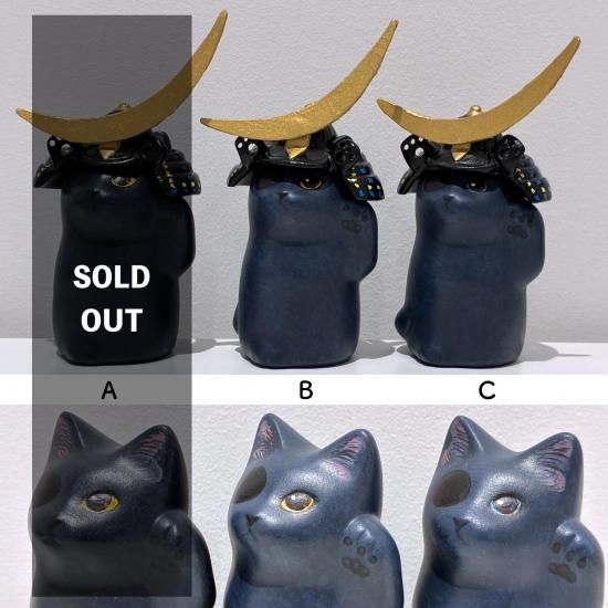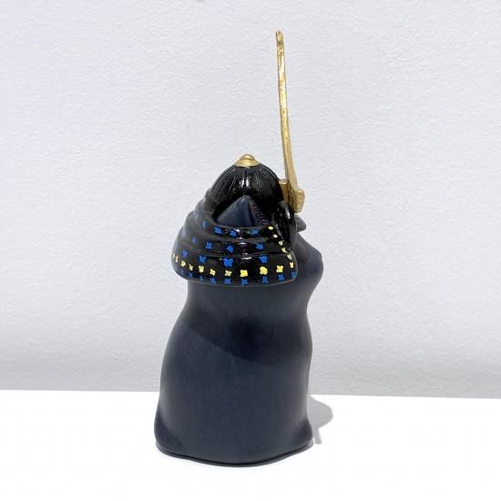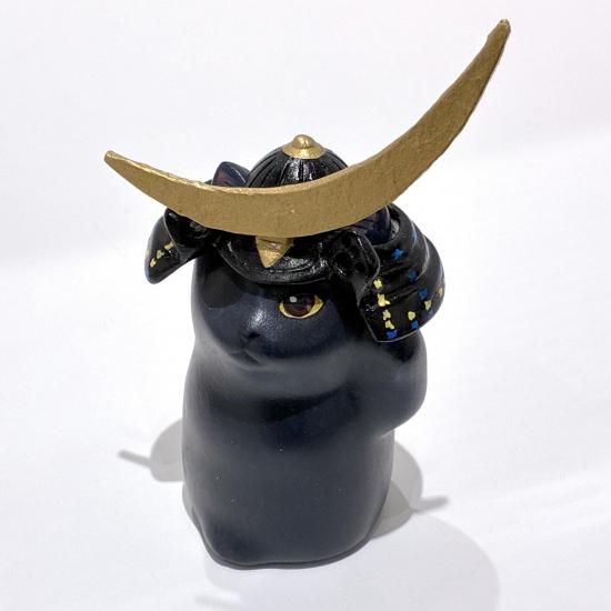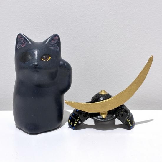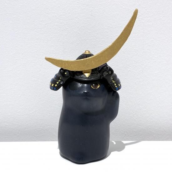 陶器の招き猫に絵付けを施し、武将風の兜を被せたユニークな作品です。
