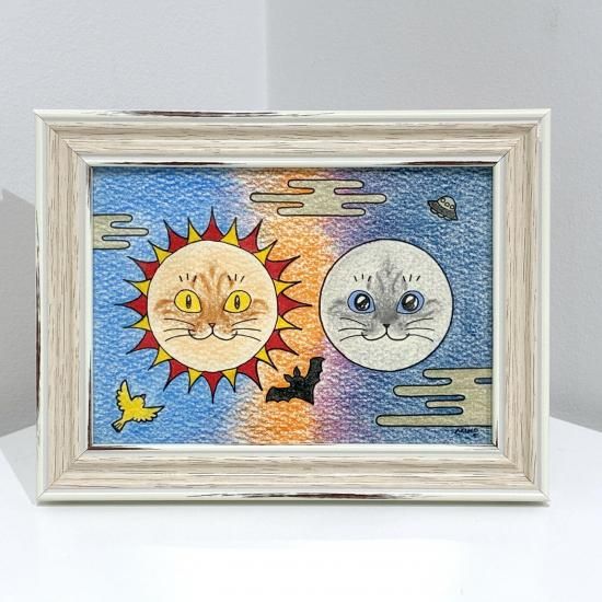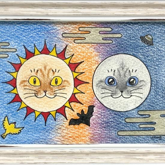 猫顔の太陽と月が並んだ、不思議な力が貰えそうな個性的な一枚です。
